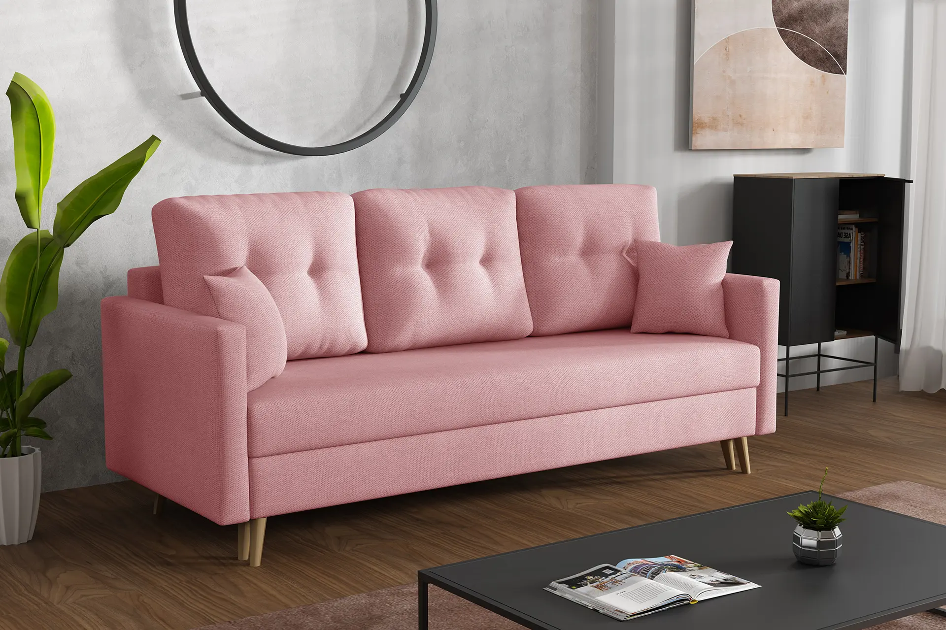 Modernes Schlafsofa mit Schlaffunktion im skandinavischen Stil. Die hohen Holzbeine verleihen ein natürliches und warmes Aussehen. Die komfortable Federkernmatratze und der automatische Klappmechanismus verbessern den Nutzungskomfort erheblich