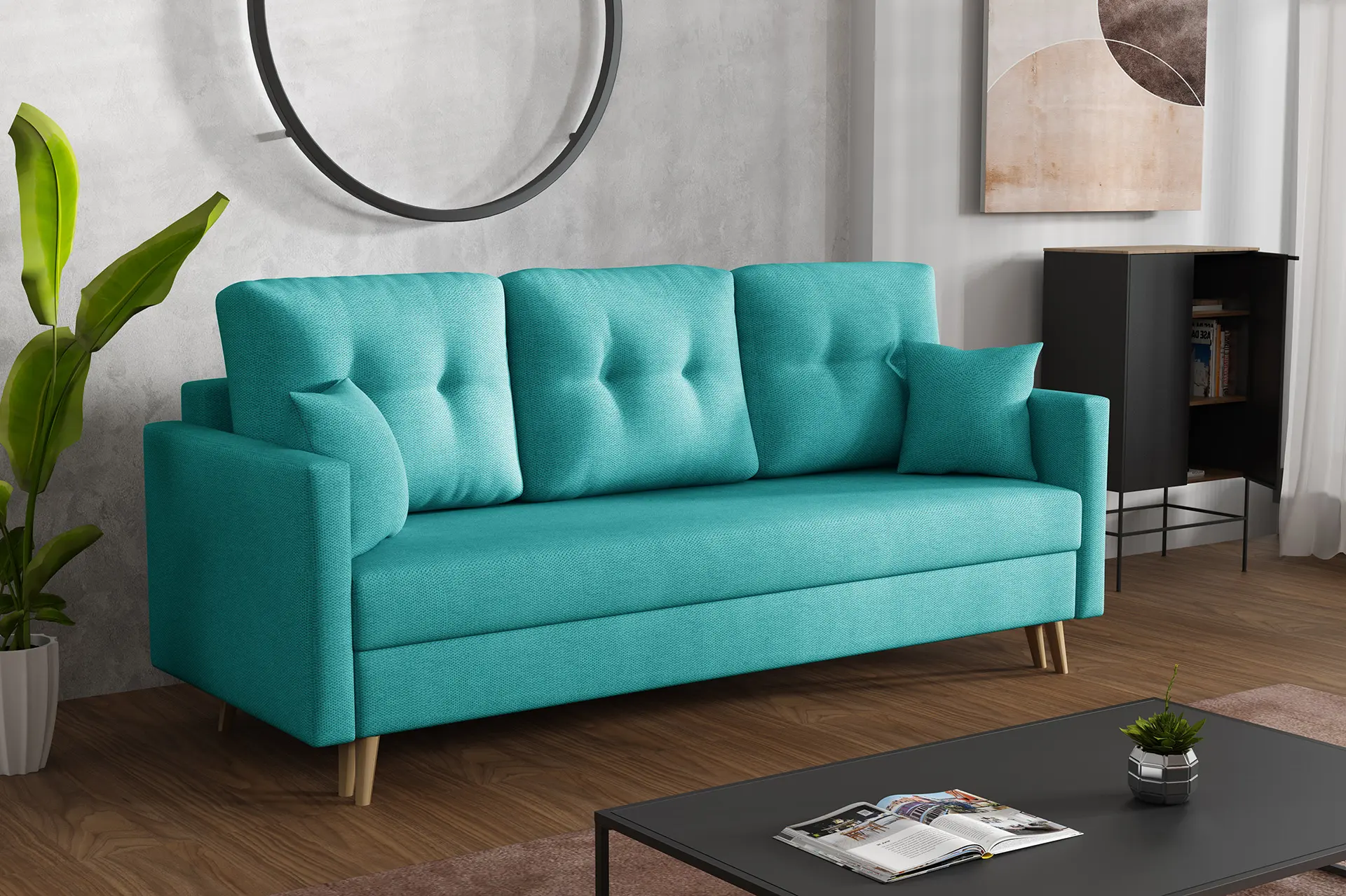 Modernes Schlafsofa mit Schlaffunktion im skandinavischen Stil. Die hohen Holzbeine verleihen ein natürliches und warmes Aussehen. Die komfortable Federkernmatratze und der automatische Klappmechanismus verbessern den Nutzungskomfort erheblich