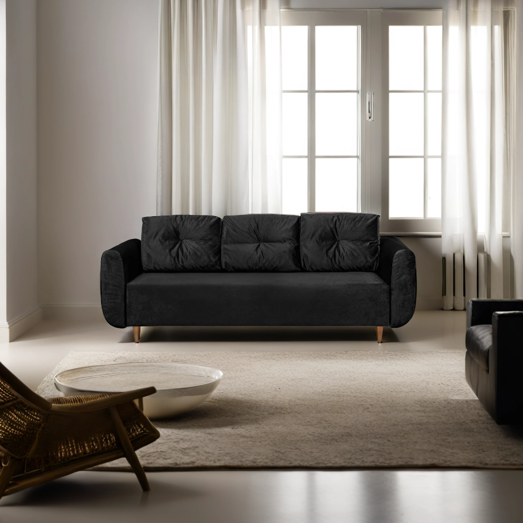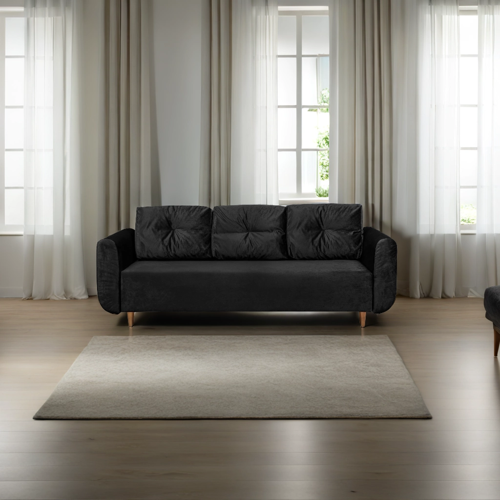 Das Sofa Seville ist ein stilvolles Möbelstück mit einer alltäglichen Schlaffunktion. Die Bonellfedern auf der gesamten Liegefläche sorgen für einen komfortablen und gesunden Schlaf. Der einfache Klappmechanismus ermöglicht es Ihnen, das Sofa schnell in ein Doppelbett zu verwandeln. Drei große Kissen sind im Lieferumfang enthalten und sorgen für einen angenehmen Schlaf. Das Sofa verfügt außerdem über ein großes Staufach, in dem Sie Bettzeug oder andere Haushaltsgegenstände unterbringen können.