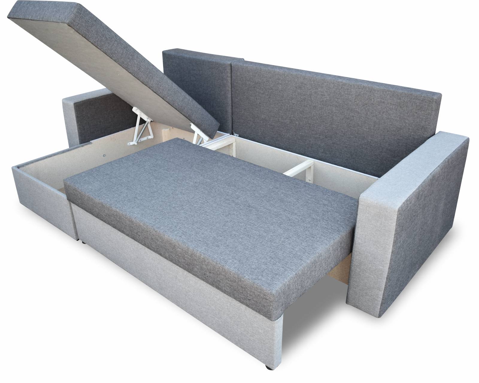 Wenn Sie das Ecksofa ausklappen, haben Sie ein vollwertiges Bett und sogar zwei Behälter für die Aufbewahrung von Bettzeug zur Verfügung. Die hochwertige Verarbeitung des Ecksofas zeigt sich in jedem Detail. Von den doppelseitigen Kissen, die Ihnen die Möglichkeit geben, die Farbe des Ecksofas zu ändern, bis hin zu den soliden automatischen Federn, die das Auf- und Zusammenklappen des Möbels erleichtern.
