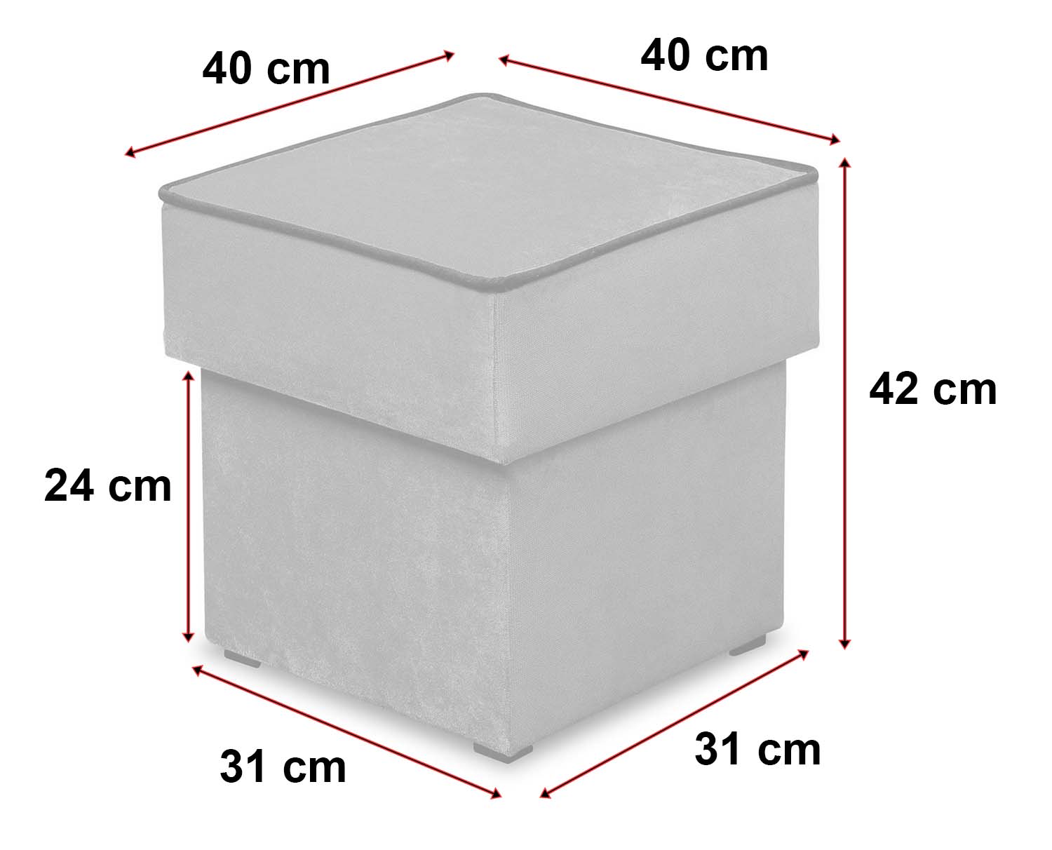 Der Merida Pouffe hat einen Behälter mit den Maßen 31x31cm und 24cm Tiefe. Hier können Sie die Spielsachen Ihres Kindes, Winterhandschuhe, Schals oder Tücher unterbringen. Die Möglichkeiten sind vielfältig, und Sie können das Fassungsvermögen von 23 Litern nutzen.