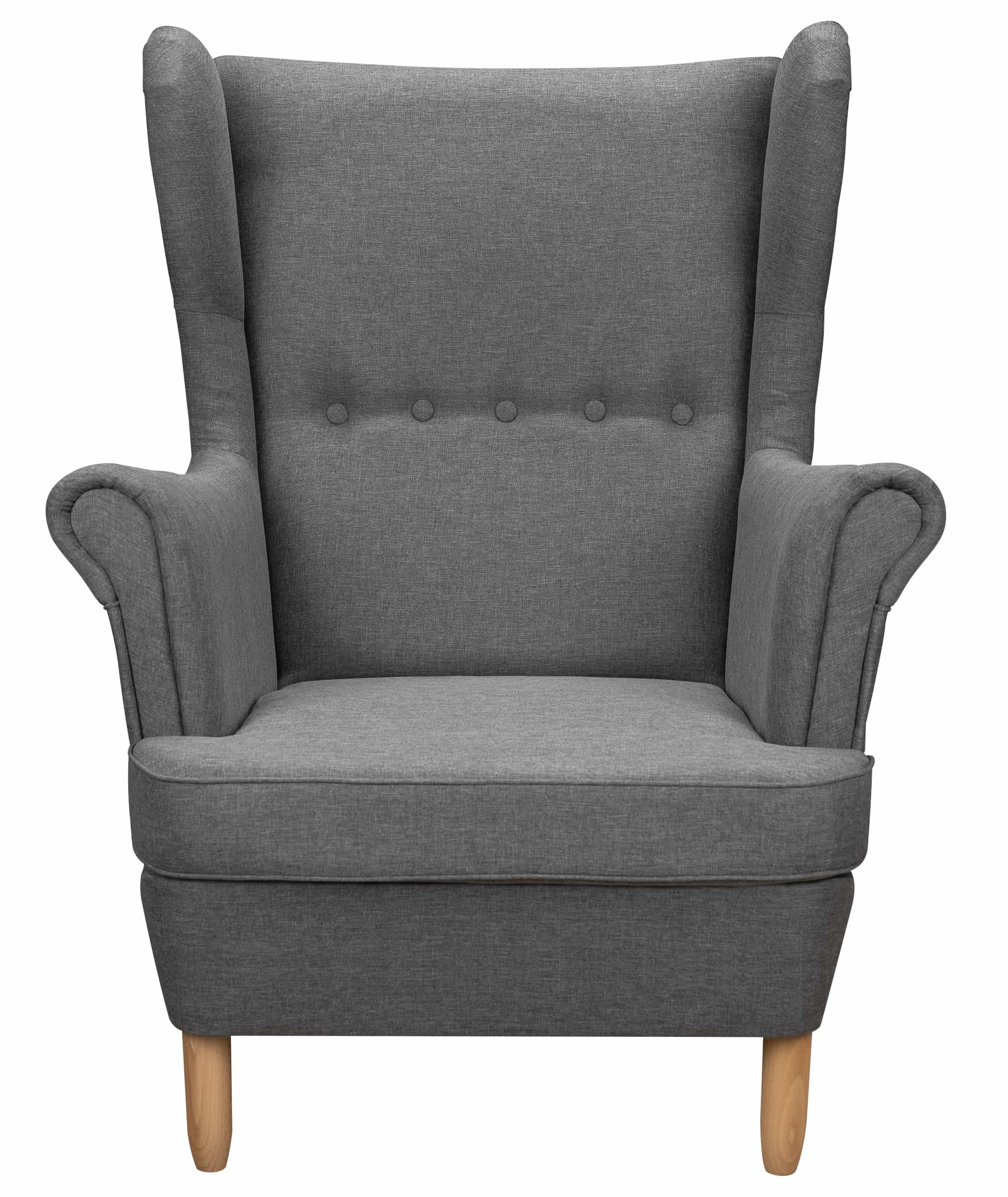 Ein Sessel im skandinavischen Stil. Die hohe und bequeme Rückenlehne und die großen, konturierten Armlehnen sorgen für eine außergewöhnlich bequeme Ruhe. Das Fundament des Möbels besteht aus vier massiven Holzbeinen in heller Naturfarbe. Die tiefe Sitzfläche und die bequeme Rückenlehne mit den charakteristischen "Ohren", der so genannten Ohrenklappe, ist ein Produkt, das sich in letzter Zeit großer Beliebtheit erfreut