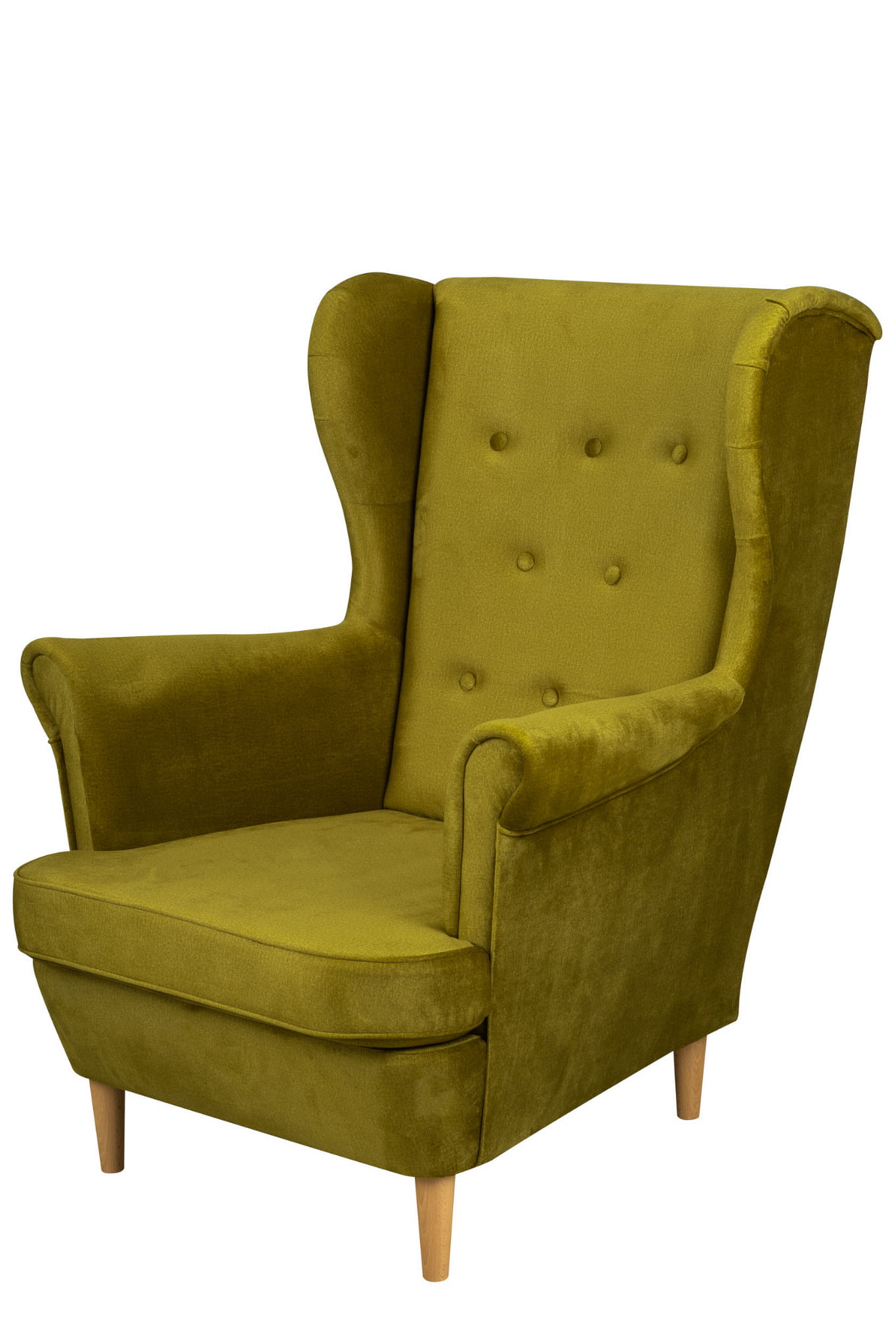 Ein Sessel im skandinavischen Stil. Die hohe und bequeme Rückenlehne und die großen, konturierten Armlehnen sorgen für eine außergewöhnlich bequeme Ruhe. Das Fundament des Möbels besteht aus vier massiven Holzbeinen in heller Naturfarbe. Die tiefe Sitzfläche und die bequeme Rückenlehne mit den charakteristischen "Ohren", dem so genannten "uchak", ist ein Produkt, das sich in letzter Zeit großer Beliebtheit erfreut
