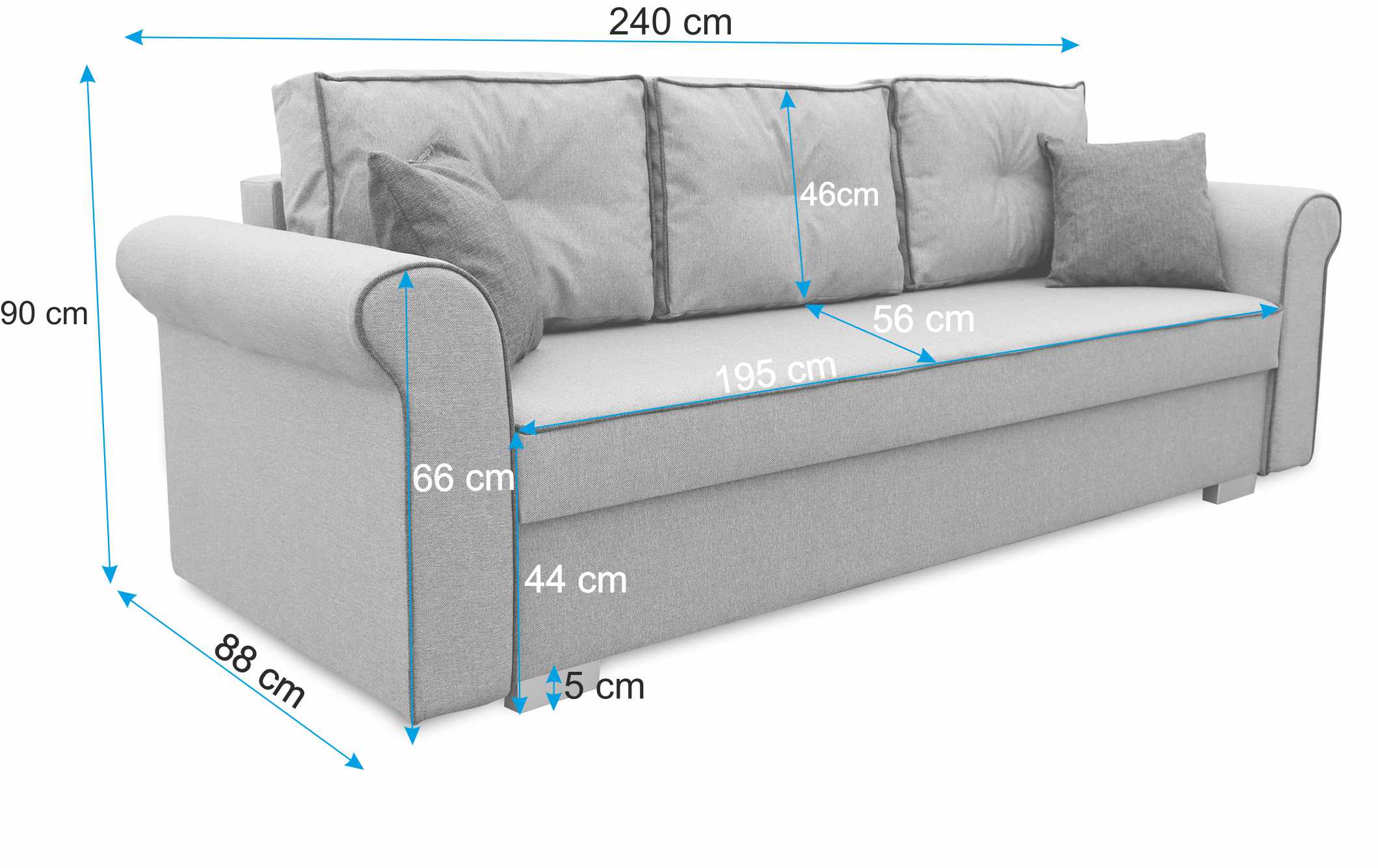 Das klappbare Wohnzimmersofa Merida bietet bequem Platz für drei Personen. Das Sofa ist mit einer Federkernmatratze ausgestattet, die dem Benutzer einen hohen Komfort bietet. Es hat breite Armlehnen, so dass Sie sich bequem zurücklehnen und entspannen können. Drei weiche, bequeme Rückenkissen schonen unseren Rücken.