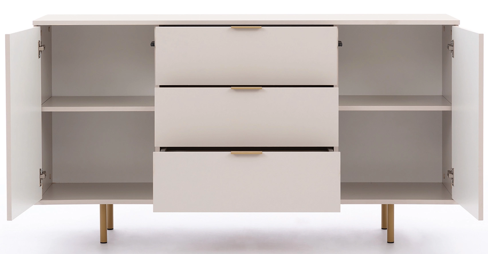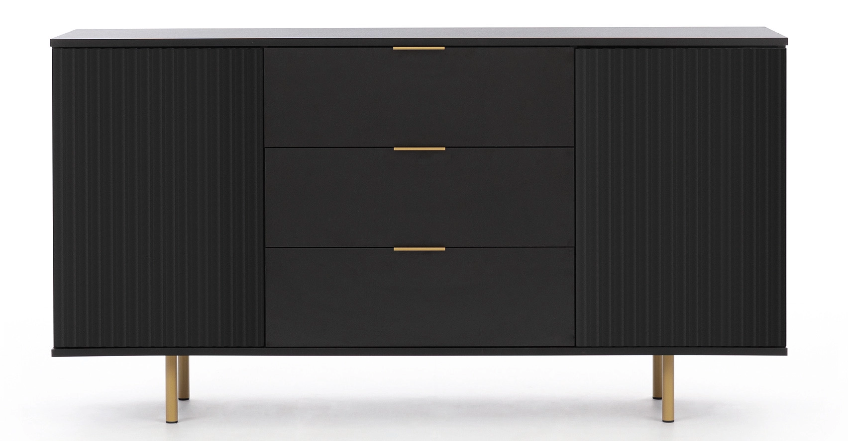 Die einzigartige und elegante Kommode Nubia Black Mat ist die ideale Lösung für alle, die modernes Design und Funktionalität schätzen. Dank der matten Oberfläche schaffen die verwendeten Farben eine harmonische Atmosphäre in Ihrem Wohnzimmer. Die Kommode verfügt über zwei Flügeltüren, drei Schubladen und drei Einlegeböden, die viel Stauraum bieten. Die Metallbeine verleihen dem Gesamtdesign Leichtigkeit und unterstreichen seinen modernen Charakter. Investieren Sie in hohe Qualität und Stil - entscheiden Sie sich für die Kommode Nubia!