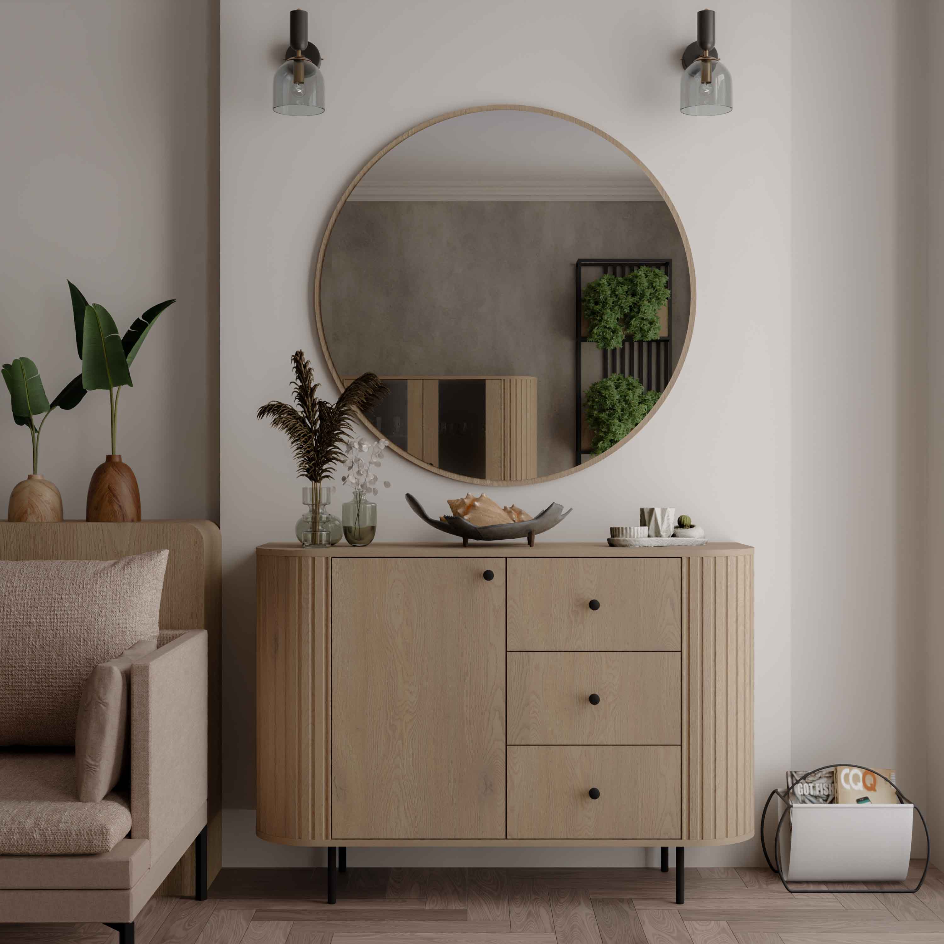 Die Kommode in der Farbvariante Eiche Cremona verbindet Eleganz, Funktionalität und moderne Form. Sie verfügt über eine einzelne Tür, drei geräumige Schubladen sowie ein praktisches Einlegefach – ideal zum Verstauen von Dokumenten, Textilien oder Accessoires. Schwarze Griffe und schlanke Metallfüße verleihen dem Möbelstück eine moderne, leichte Optik. Der Soft-Close-Mechanismus sorgt zusätzlich für hohen Bedienkomfort. Dank der Möglichkeit, die Kommode rechts oder links zu montieren, lässt sie sich flexibel in jeden Raum integrieren.