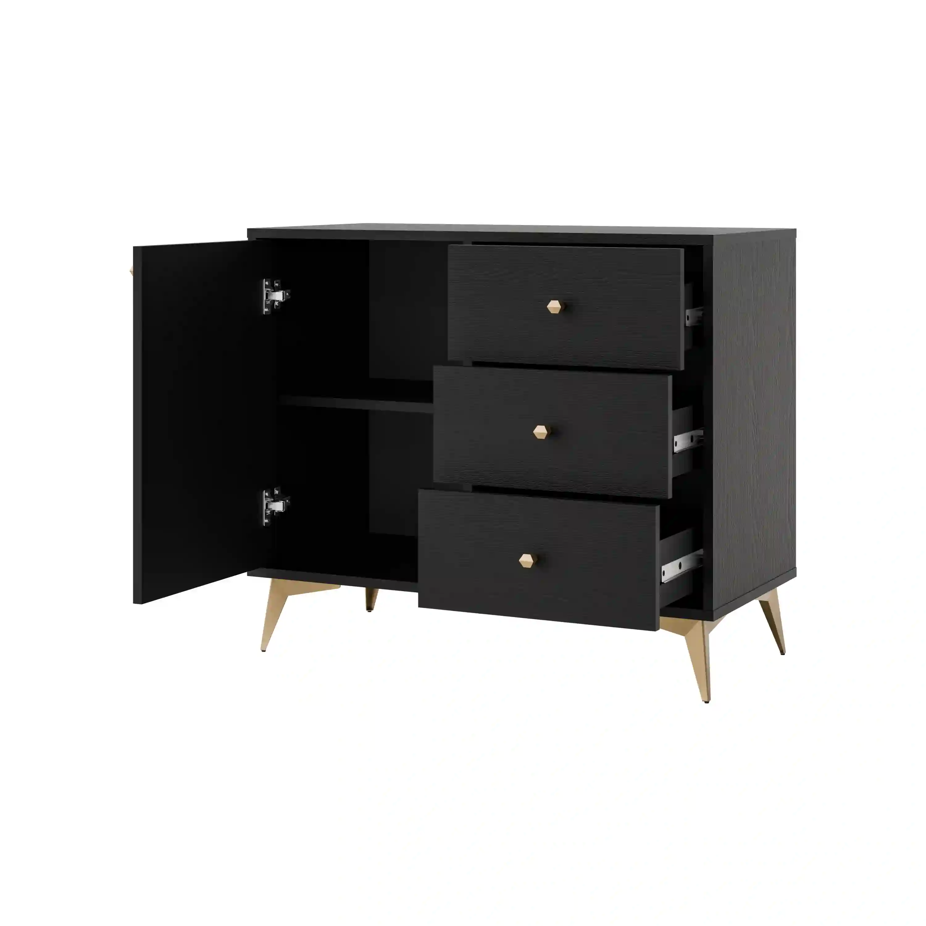 Die Kommode eignet sich ideal als zusätzlicher Stauraum im Wohn- oder Schlafbereich. Ihre kompakten Maße passen auch in kleinere Räume, und das durchdachte Innenleben sorgt für Ordnung. Elegante goldene Akzente machen sie zugleich zum dekorativen Highlight.