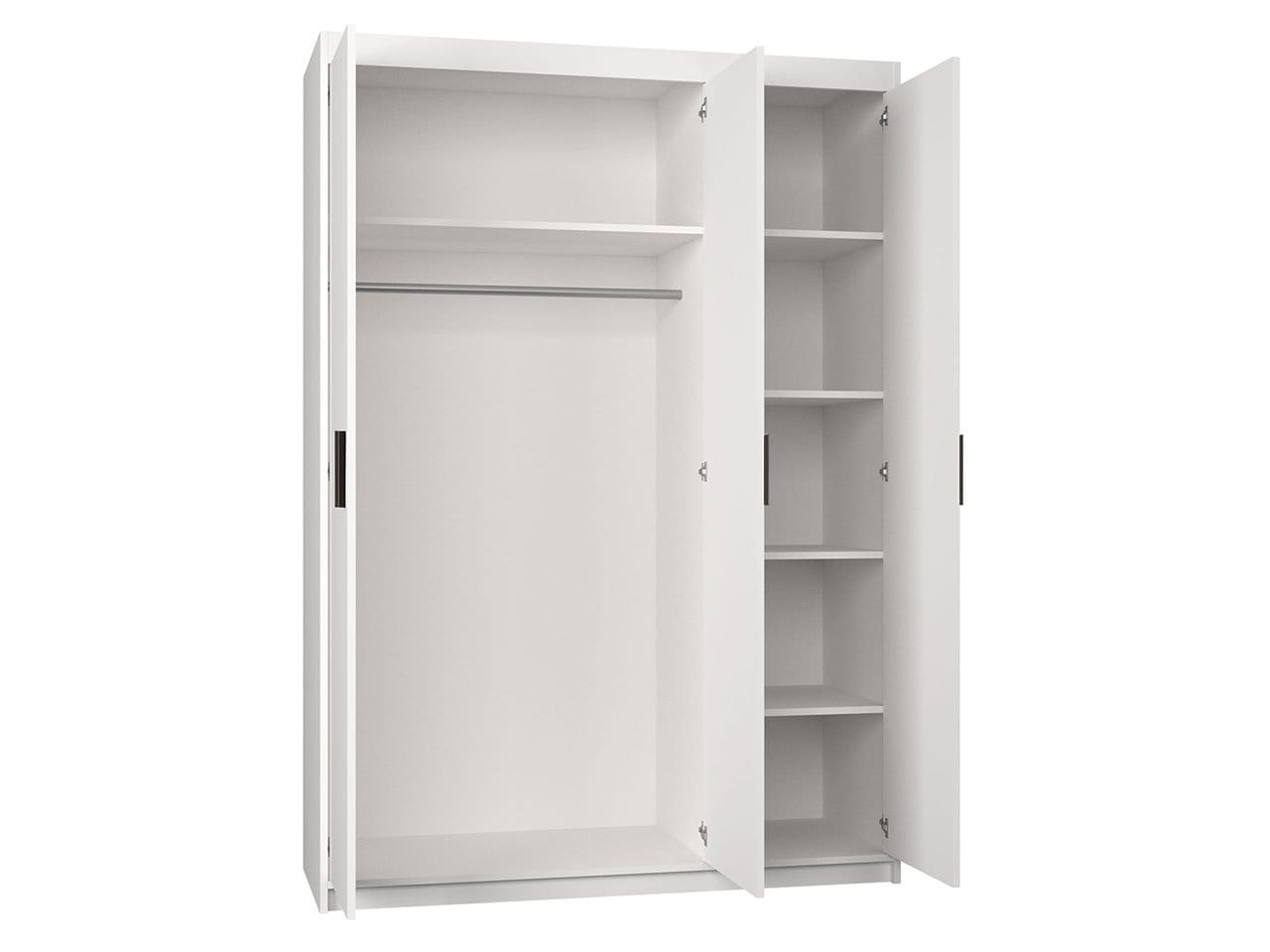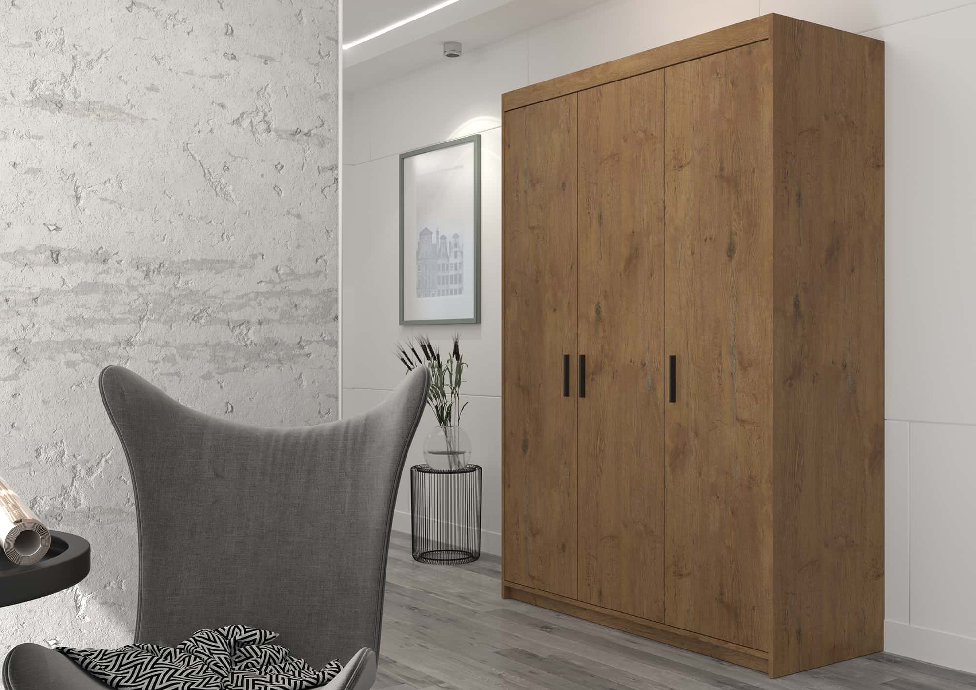 Ein praktischer Kleiderschrank für das Schlafzimmer, das Wohnzimmer oder das Jugendzimmer sorgt für Ordnung und das dreitürige Modell Elena nimmt nicht viel Platz weg. Die Breite des Möbels beträgt 133 cm, so dass Sie es auch an einer kleinen Wand aufstellen können. Das minimalistische und moderne Design des Schranks macht Elena zu einer modischen Ergänzung des Zimmers, ohne dass er den Raum optisch erdrückt. Der Schrank ist geräumig genug, um Kleidung, modische Accessoires und Bettzeug unterzubringen. Elena kann auch als Büroschrank verwendet werden. Zahlreiche Einlegeböden bieten Platz für eine Reihe von Dokumenten, und auf einer Kleiderbügelstange können Sie ein Ersatzhemd, eine Jacke oder einen Anzug aufbewahren.