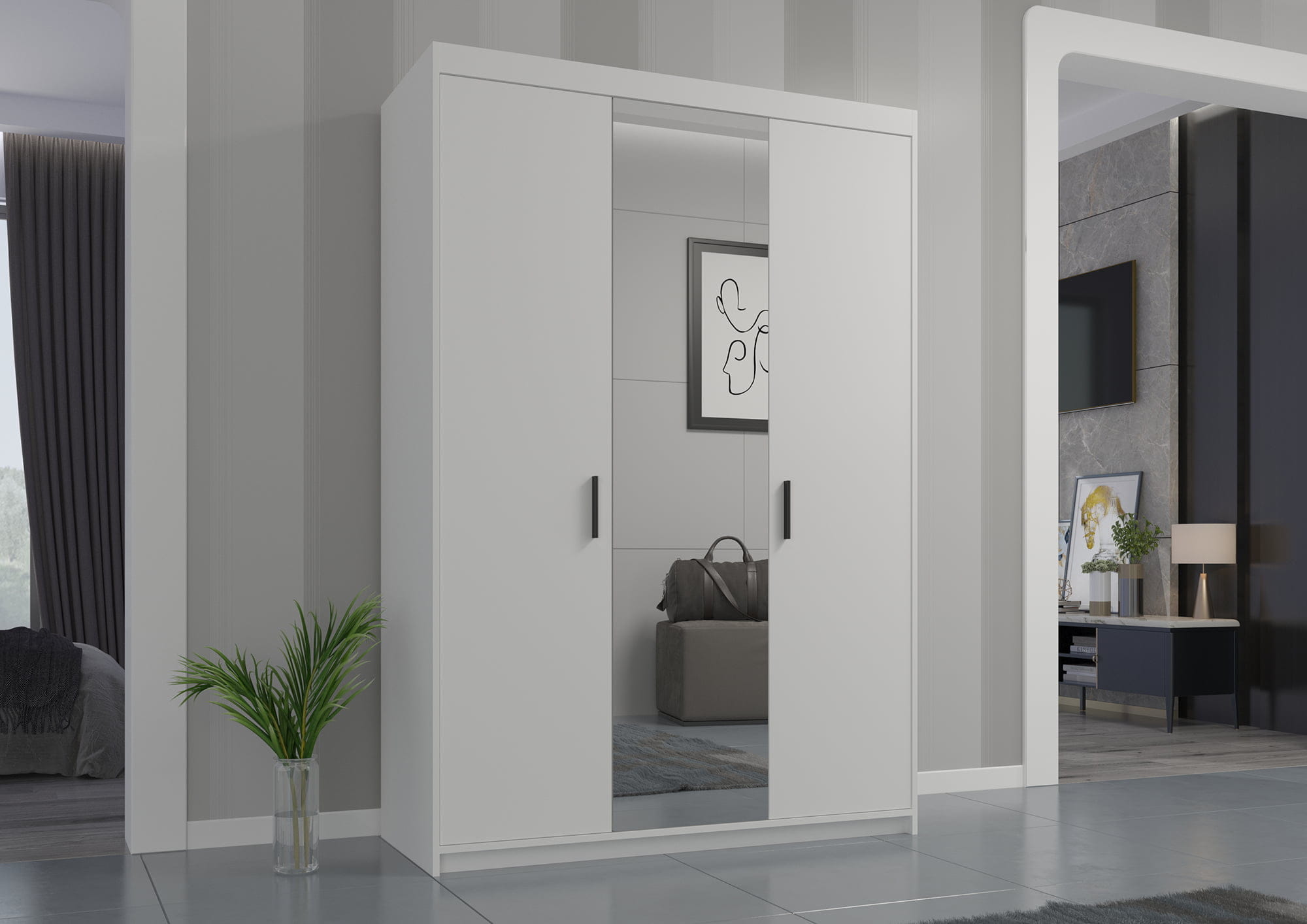 Dreitüriger Kleiderschrank mit Spiegel und Auszug Elena Weiß