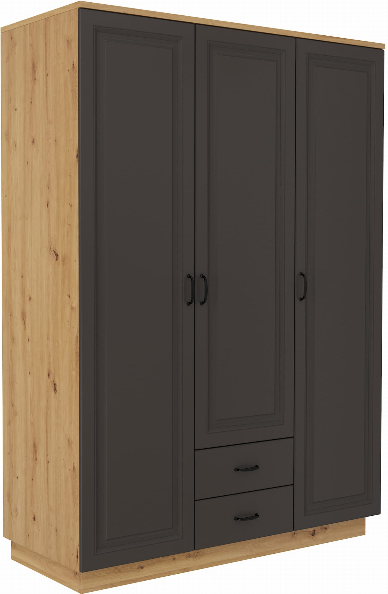 Der dreitürige Kleiderschrank Flavia wurde in der Farbe Eiche artisan hergestellt, aber es sind die Fronten, die die ganze Aufmerksamkeit auf sich ziehen. Der Kleiderschrank Flavia hat gefräste Fronten, die dem Möbel einen provenzalischen Chic verleihen. Die Dekoration erwärmt auch die Wahrnehmung des Möbels. Die Fronten des Schranks sind in Weiß oder Graphit matt gehalten, so dass der Schrank auch mit anderen Einrichtungsstilen harmonieren kann. Die schwarzen Metallgriffe lassen Flavia schick und elegant aussehen. Die Möbel passen auch in den Trend zu weißen Schlafzimmermöbeln, während der Korpus in Eiche artisan einen interessanten Kontrast bildet.