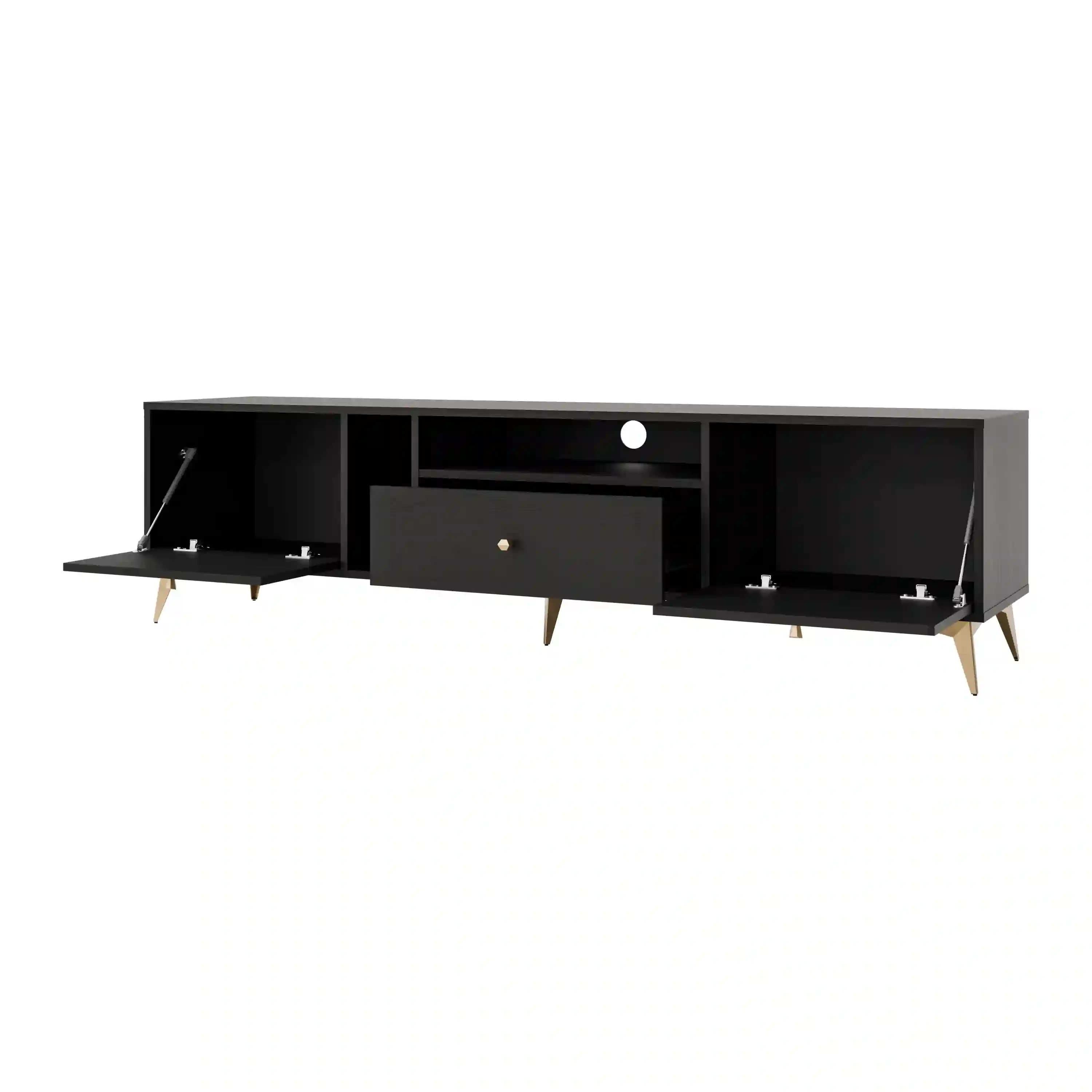 Das Innenlayout ist auf Komfort und Ordnung ausgelegt. Hinter den Klappen lassen sich weniger repräsentative Dinge verstauen, während die Schublade und das offene Fach einfachen Zugang zu Technik und Zubehör bieten. Eine gelungene Verbindung von Funktionalität und Ästhetik, ideal für moderne Wohnzimmer.