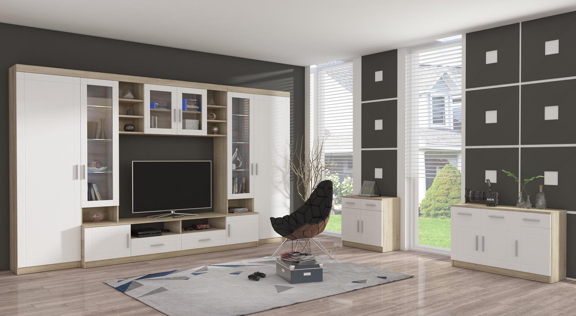 Die Wohnwand Paris passt perfekt in Wohnräume, die im warmen, familiären und gemütlichen provenzalischen Stil eingerichtet sind. Das Set Paris zeichnet sich durch eine elegante, aber unaufdringliche Dekoration der Fronten aus. Die geschnitzten geraden Linien verleihen Charme und ziehen die Aufmerksamkeit auf sich. Bei den Farbvarianten Weiß matt und Graphit sind die Lamellen aus Eiche sonoma gefertigt. Die Kombination dieser Farben sieht sehr auffällig aus und ist eine Zierde für jedes provenzalische Wohnzimmer.