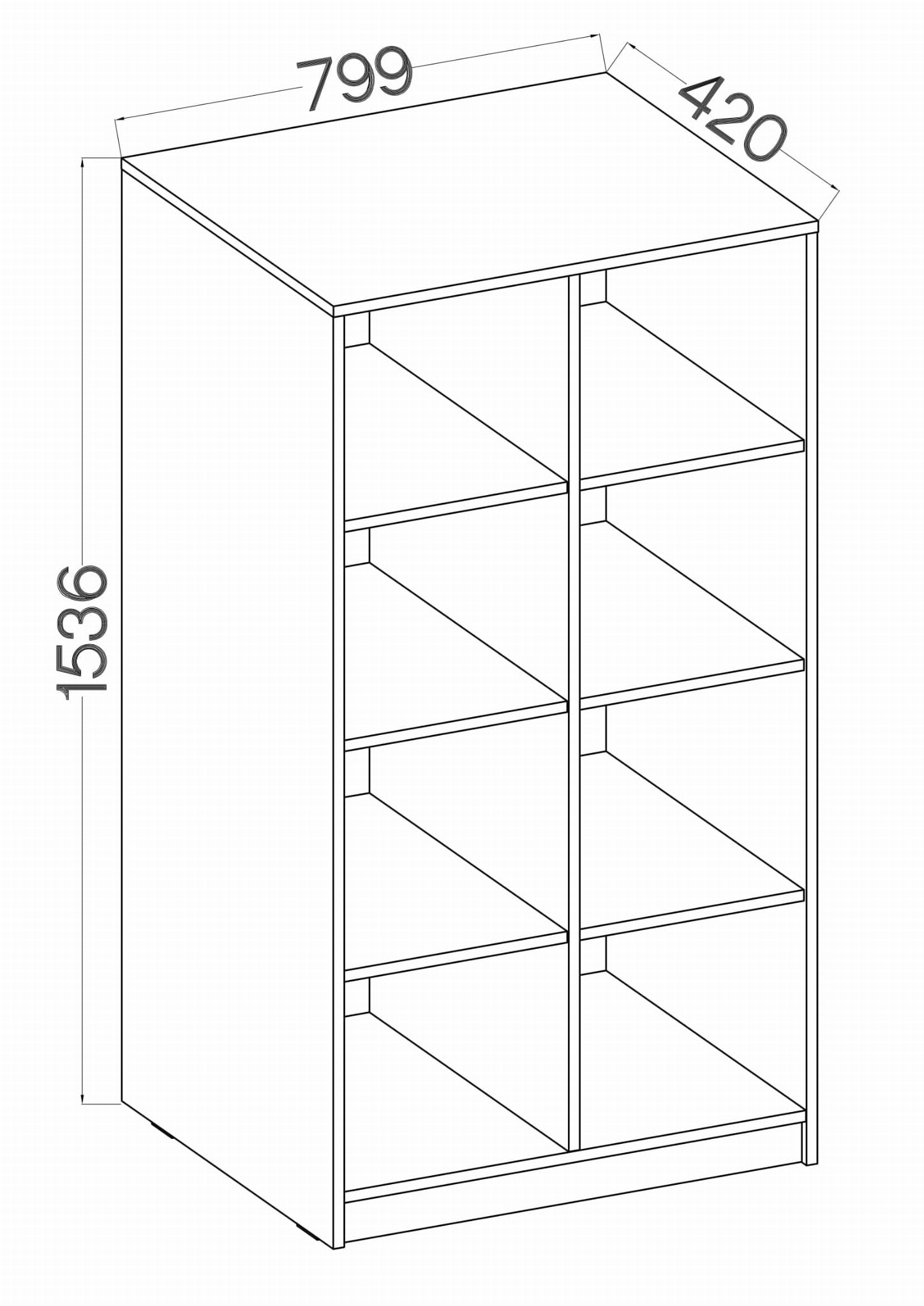- Acht offene Fachböden mit den Maßen 372x338x392 mm (B x H x T)